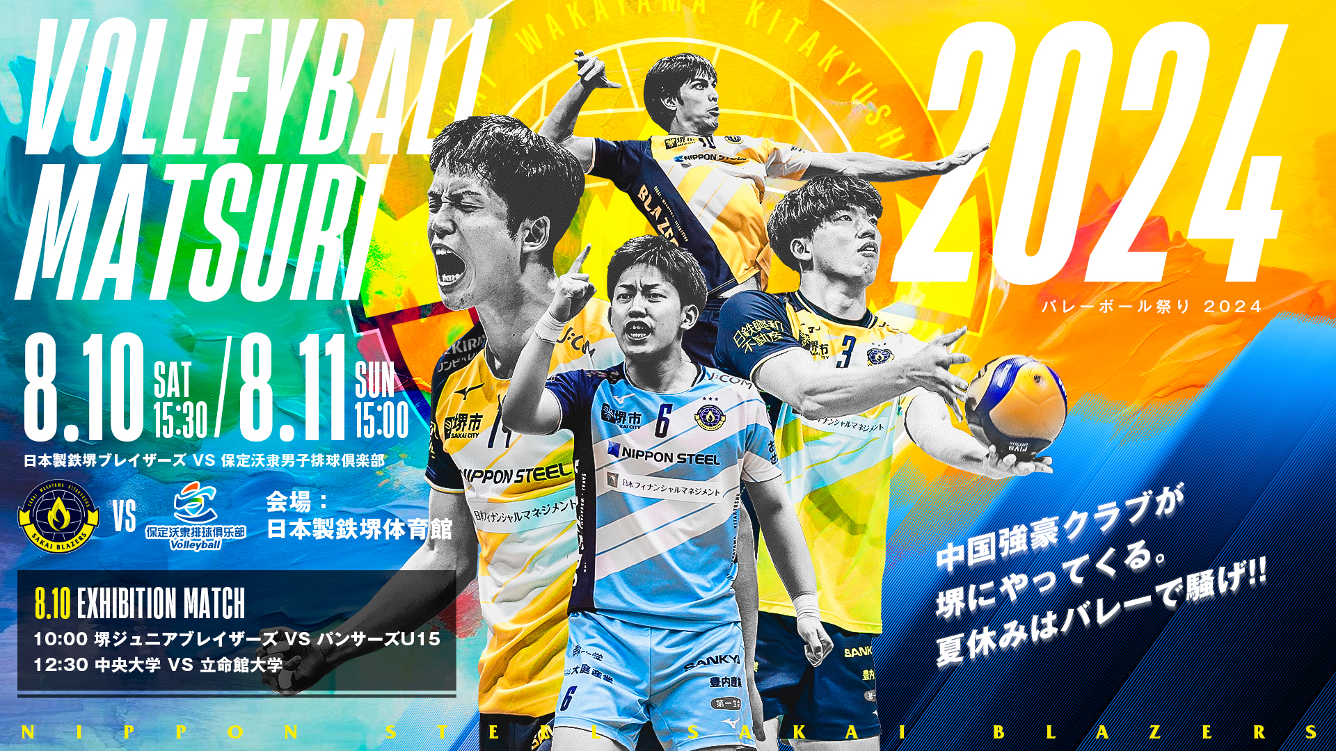 日頃より日本製鉄堺ブレイザーズへの熱い応援ありがとうございます。8月10日(土)及び11日(日)に日本製鉄堺体育館にて、VOLLEYBALL MATSURI 2024を開催いたします。