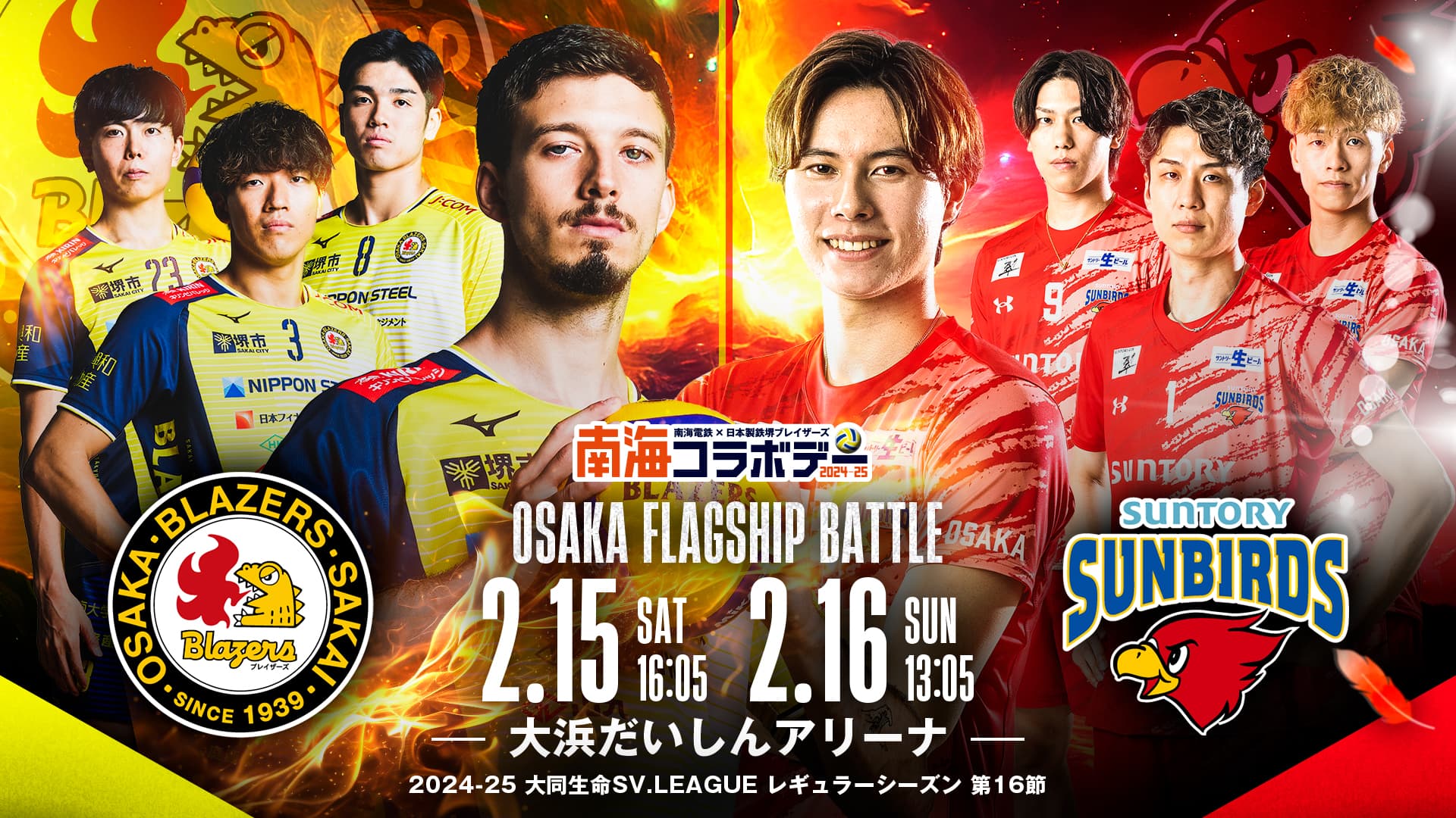 現在リーグ上位を走るサントリーサンバーズ大阪を日本製鉄堺ブレイザーズがどのように追いつめられるか。ご来場の皆さまの声援、応援で選手に力を!! チームに勝利を!!
