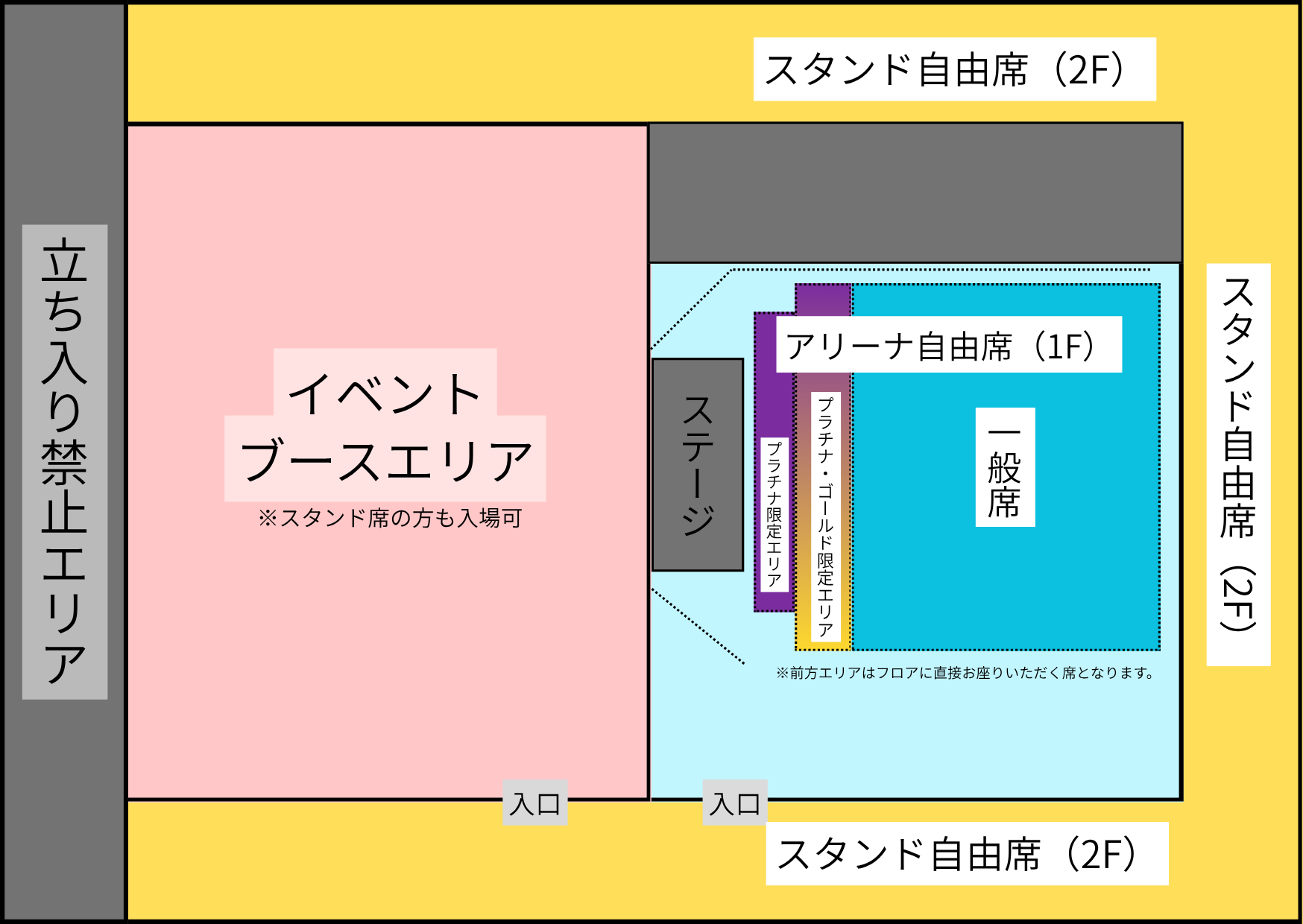・1Fの「プラチナ限定エリア 」「プラチナ・ゴールド限定エリア 」「一般席前方」は、体育館の床に直接お座りいただく「地べた席」となります。