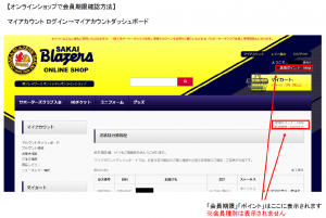 ログイン後のマイアカウントにて「会員期限」と「ポイント数」が確認できますので、お手数ですがご確認いただき、