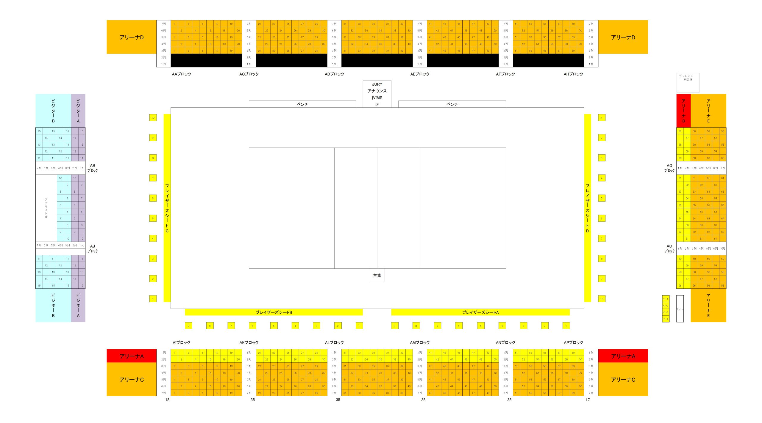 ※アリーナ席は可動式スタンドになっており、同じ列でもブロック名が異なり席番の間が飛んでいる箇所がございます。添付の座席図と下記をご参考ください。