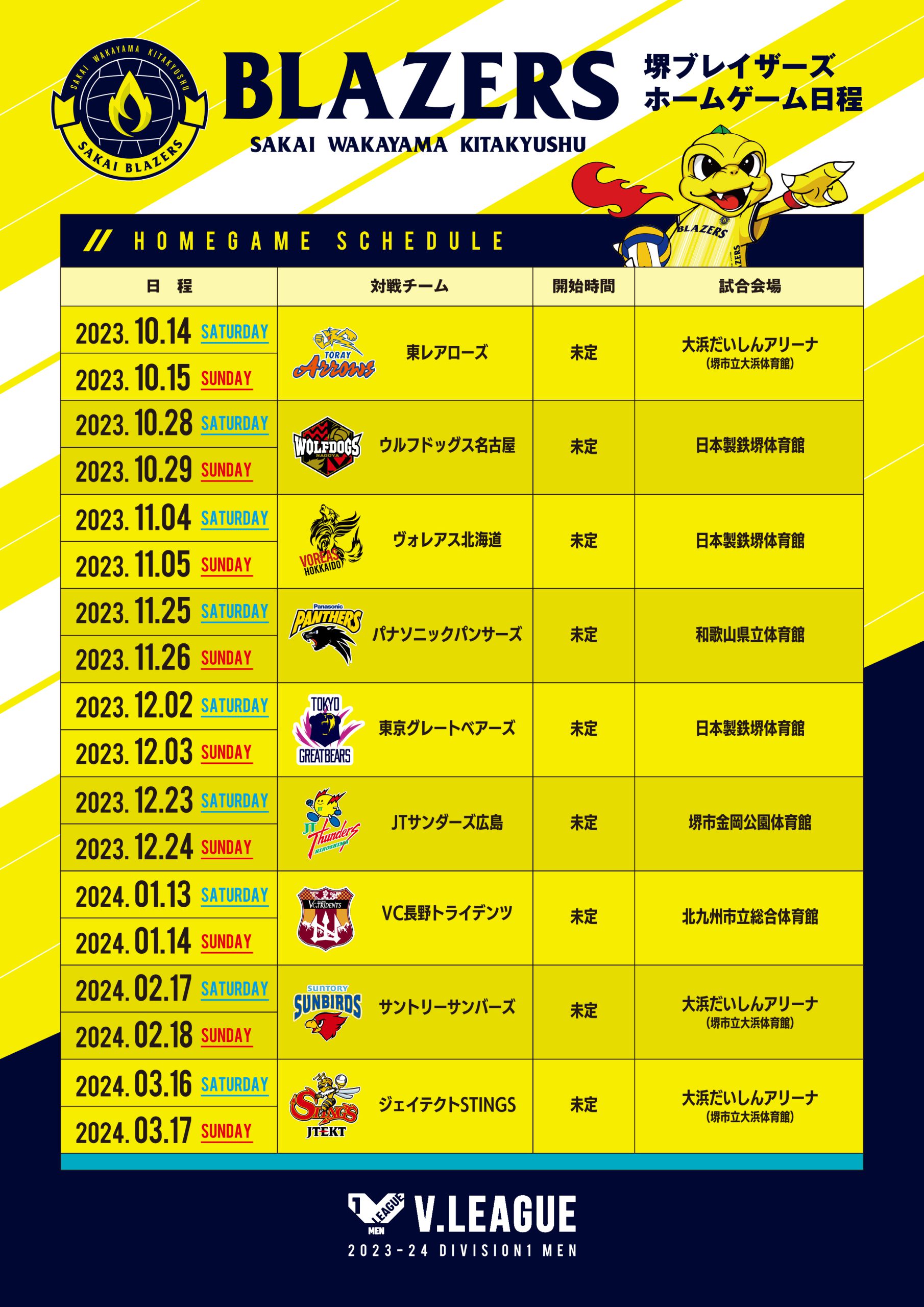 堺ブレイザーズの初戦は2023年10月14日(土)大浜だいしんアリーナで行われるHOME GAMEでの東レアローズ戦です、