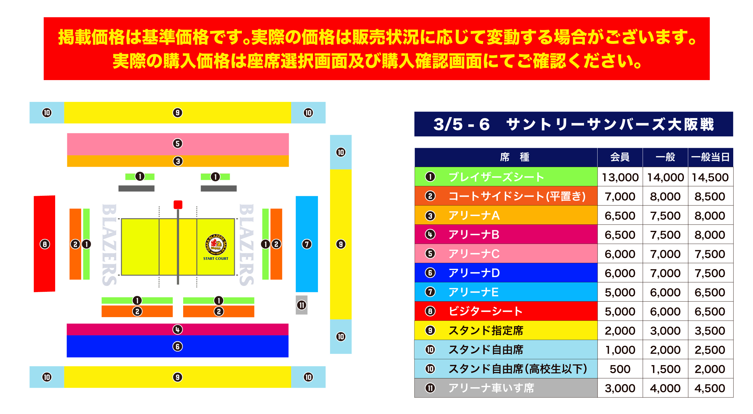2025-26シーズンの日本製鉄堺ブレイザーズホームゲームのチケット販売価格は、これまでの固定制と異なり、座席や販売状況に応じて価格が変わる変動制を予定しております。