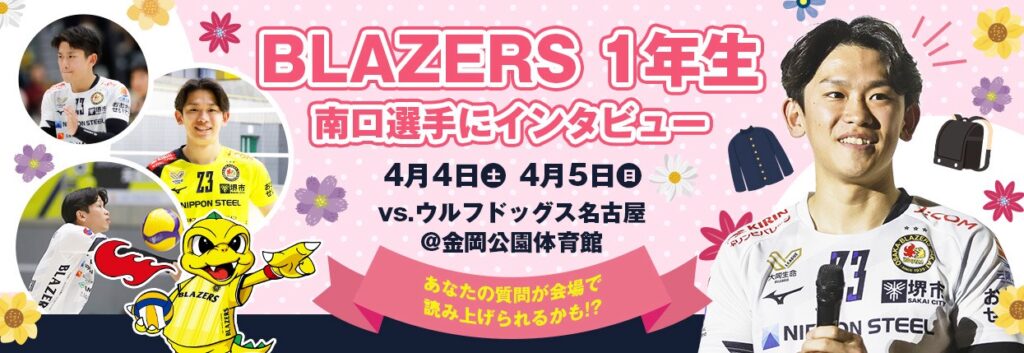 2025-26大同生命SV.LEAGUE第20節、日本製鉄堺ブレイザーズホームゲーム ウルフドッグス名古屋戦会場にて、4月上旬のホームゲーム開催であることから様々な門出をお祝いするために、小学校1年生や社会人1年生等様々な1年生から、ブレイザーズ1年生である南口辰揮選手へのインタビューイベント「『〇〇な1年生集合〜!』BZピカピカ1年生、南口選手へインタビュー!」を実施いたします。