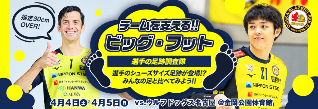 試合当日、会場内にブレイザーズ選手のシューズサイズと同じ足形を設置予定!どの選手が1番大きな足をしているか?や、ご自身の足と比べてどのくらい大きいのか?等ぜひ調査してみてください!