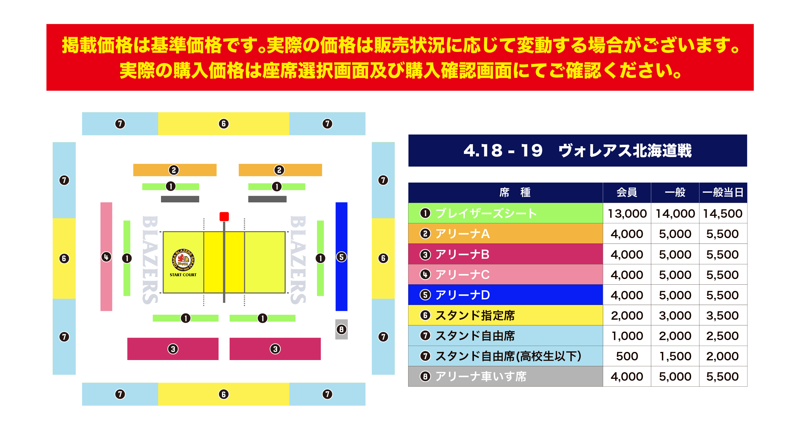 ・両チームベンチ裏側のお席やコート周辺のお席(BZシート、コートサイドシート、アリーナ各席種前列)については、選手やチームスタッフ、競技運営上の機材が観戦の妨げとなる可能性がございます。あらかじめご了承の上チケットをご購入ください。