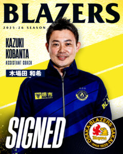 この度、日本製鉄堺ブレイザーズに入団することになりました、木場田和希と申します。再びこのチームに迎えていただけたこと、光栄に思います。選手との対話を大切にし、彼らの個性を活かせるような環境作りをしていきたいです。また、チーム全体のレベルアップに貢献できるよう努力していきます。共に優勝を目指しましょう!より一層のご声援、ご支援の程よろしくお願いいたします。