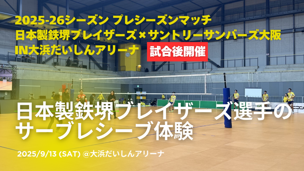 この度、ホームタウンである堺市が取り組む堺市ふるさと応援寄附金(ふるさと納税)の体験型返礼品として、2025年9月13日(土)に参加する「2025-26シーズン プレシーズンマッチ日本製鉄堺ブレイザーズ×サントリーサンバーズ大阪 in大浜だいしんアリーナ」の試合後に日本製鉄堺ブレイザーズ選手のサーブをレシーブする体験できる商品の提供を行います。