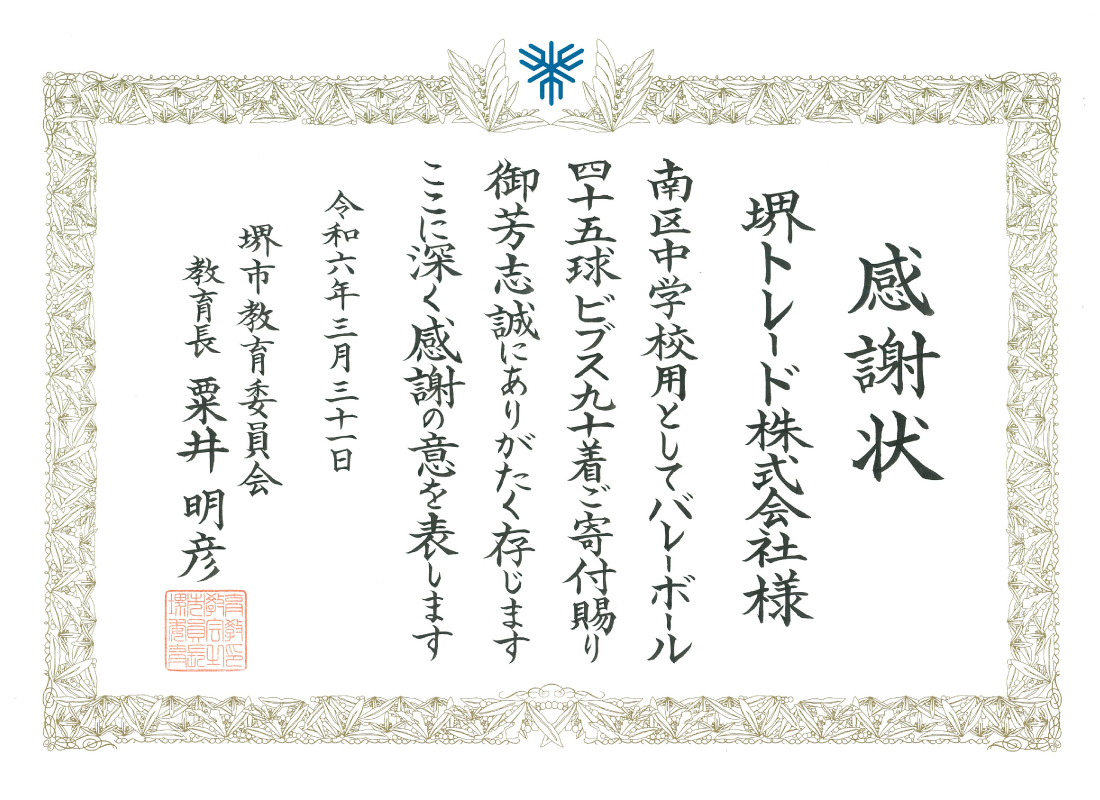 この度、堺市の中学校にバレーボールとビブスの寄付活動に参加させて頂き有難うございました。堺トレード株式会社は地元堺市にある日本製鉄堺ブレイザーズを身近に感じ、今後も微力ながら応援していくと共に、社会貢献できる企業としてこの活動を拡大、継続していく所存でございます。選手やスタッフの皆様と堺市の小中学校に出来る限り貢献できる企業を目指して参ります。今後とも宜しくお願い致します。