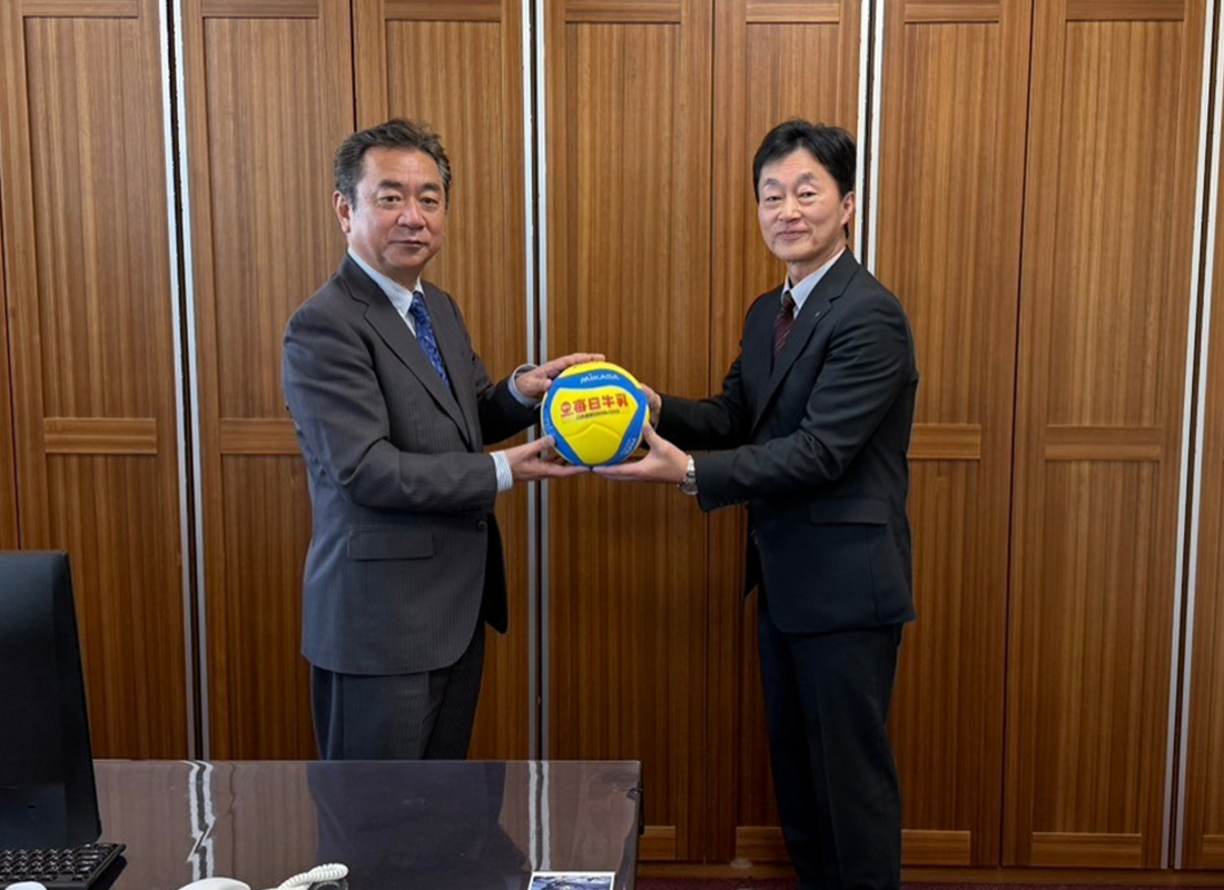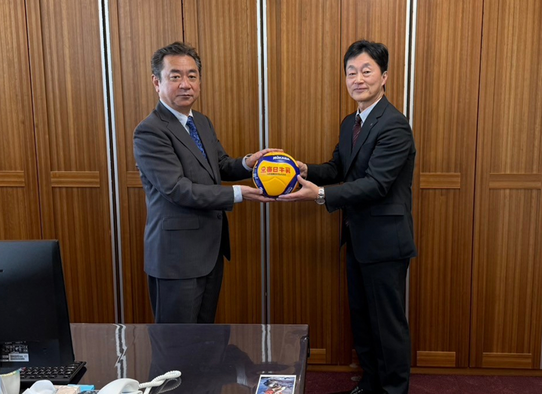 日本酪農協同株式会社 代表取締役 後藤様(右)から大槻教育長(左)へバレーボールをお渡し