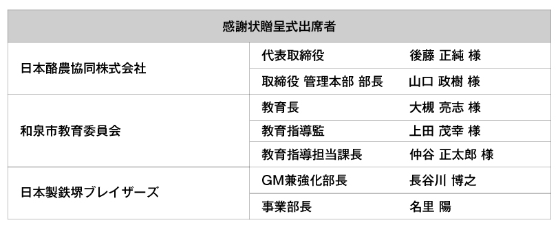 今回、日本製鉄堺ブレイザーズ様から、本プロジェクトのご提案をいただき、これから地域を支えることになる児童・学生のみなさんが心身ともに健やかに成長されることを願い、その一助となればと思い、賛同させていただきました。