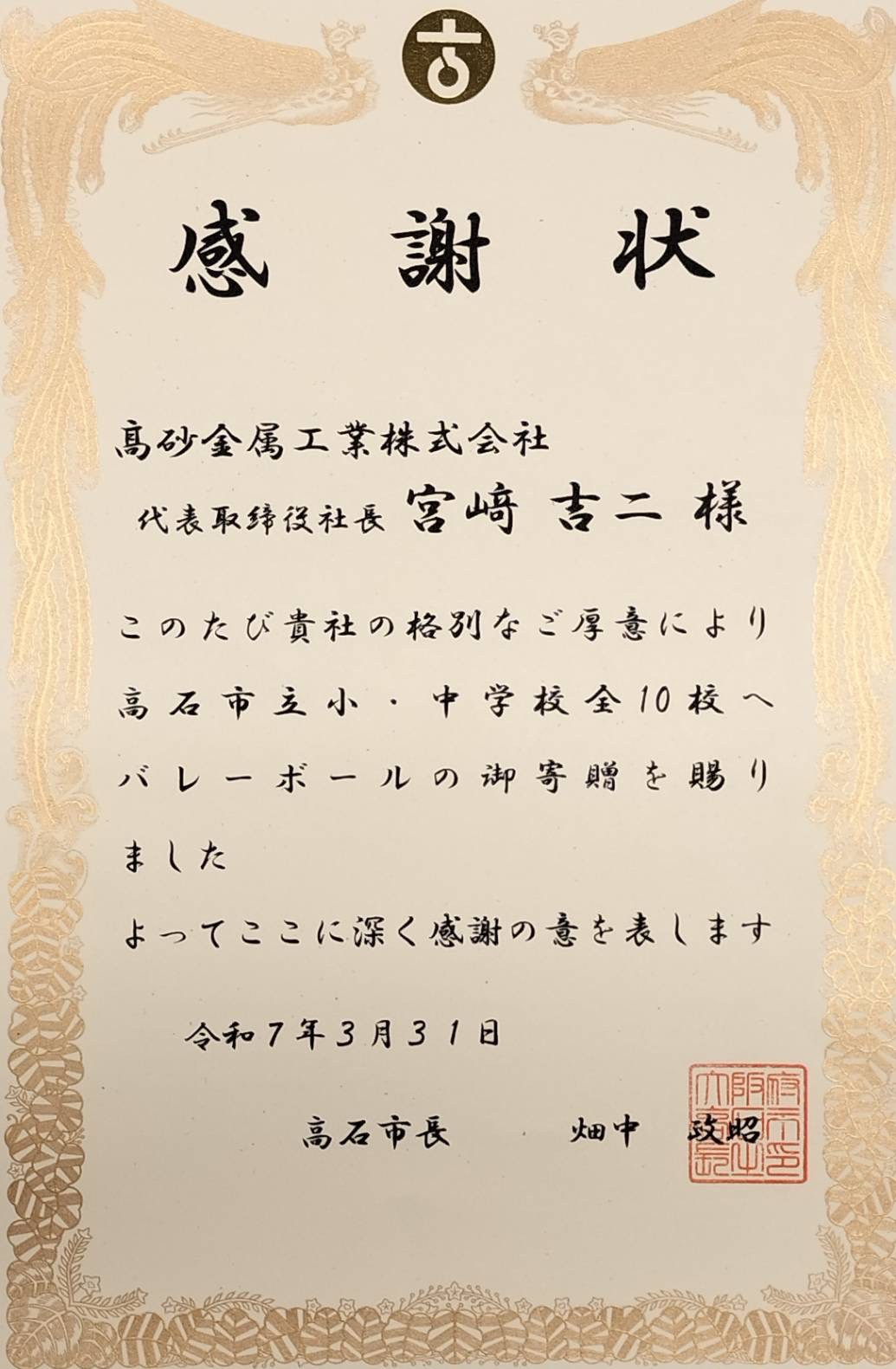 高石市長 畑中様より髙砂金属工業㈱ 宮﨑社長へ感謝状をお渡し