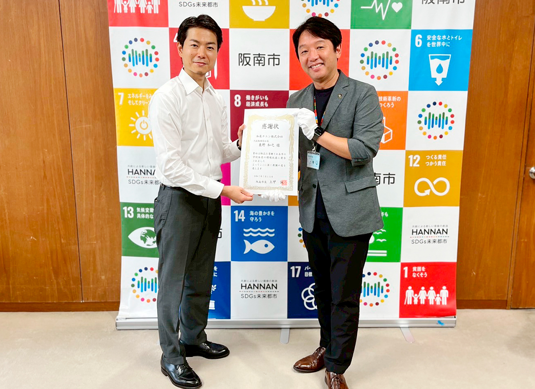 今回の寄贈に対し、阪南市役所と岬町役場にて感謝状贈呈式が行われました。