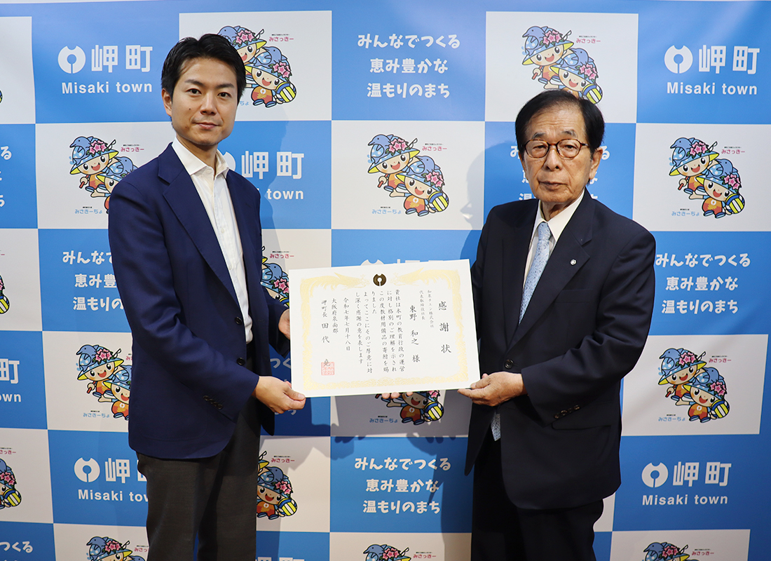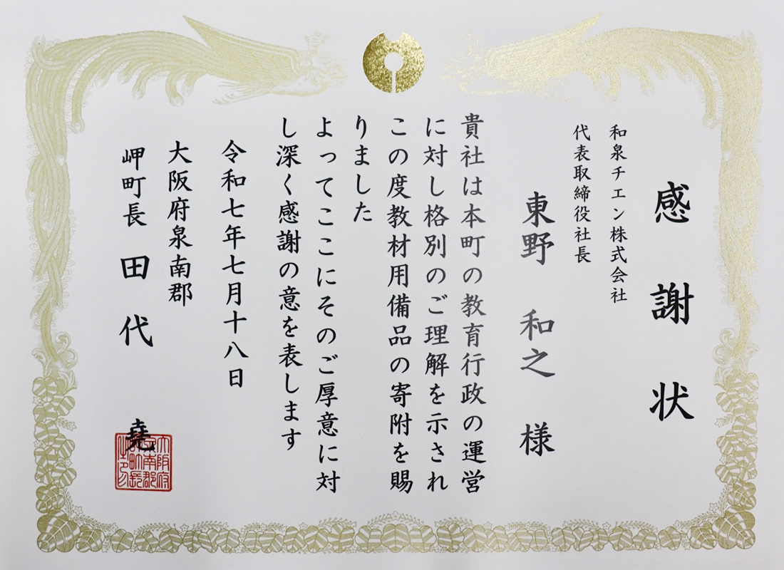 岬町長 田代様(右)より和泉チエン株式会社 取締役 総務グループ長 東野様(左)へ感謝状をお渡し