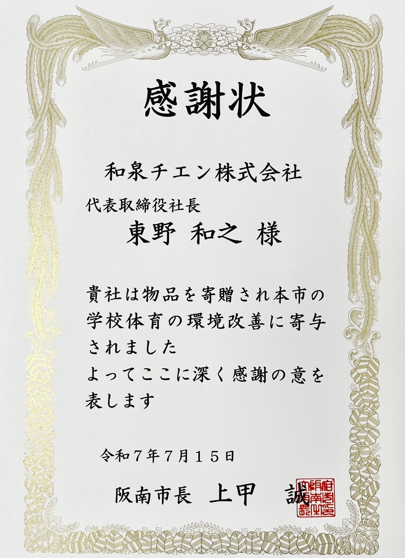 阪南市長 上甲様(右)より和泉チエン株式会社 取締役 総務グループ長 東野様(左)へ感謝状をお渡しの様子