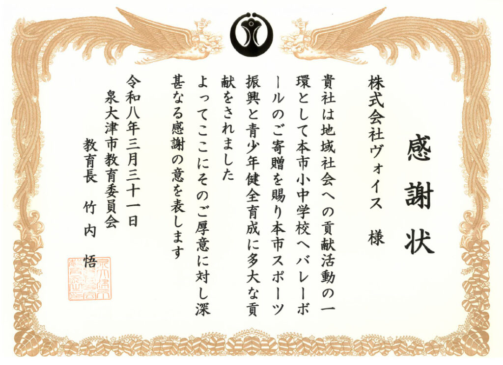 今回の寄贈に対し、泉大津市教育委員会より株式会社ヴォイス様へ感謝状が贈呈されました。