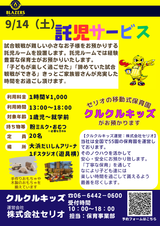 9月14日(土)SV.LEAGUEプレシーズンマッチ会場にて展開する、託児サービスについてお知らせいたします。